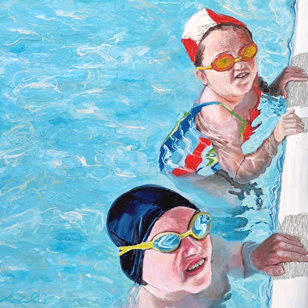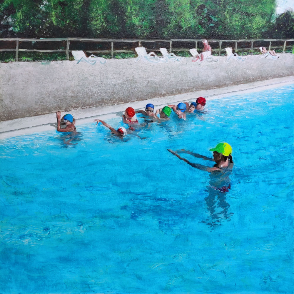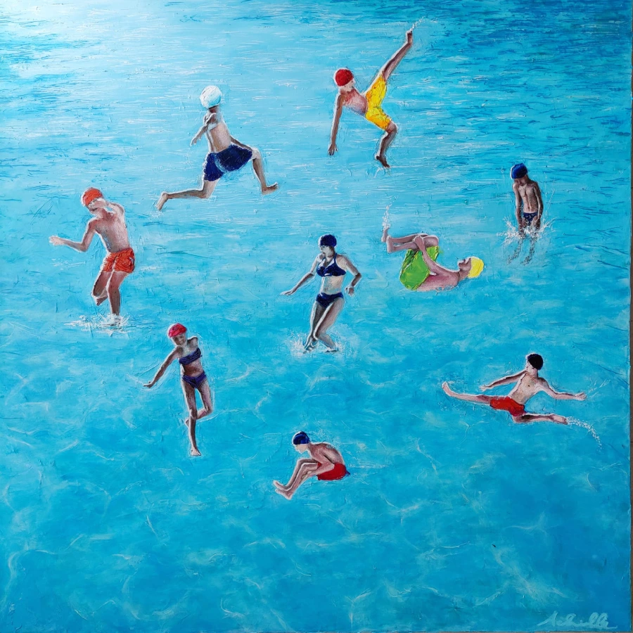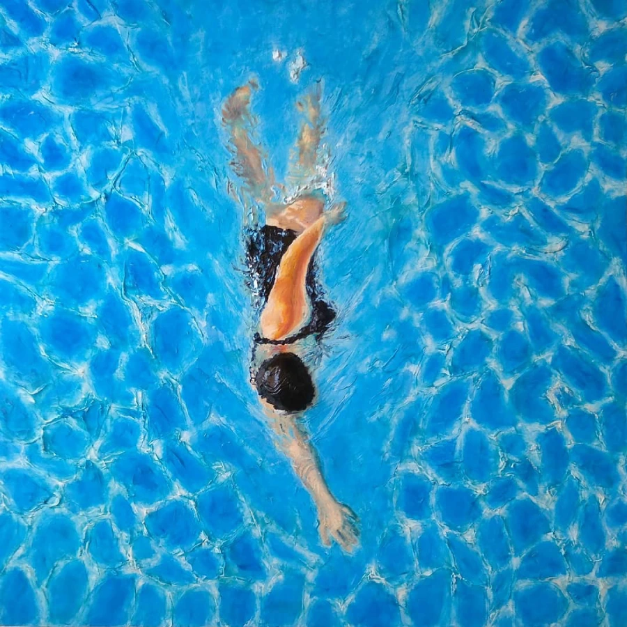 Le mie opere dedicate alla piscina catturano quel momento sospeso in cui il corpo si fonde con l’acqua, dove ogni movimento diventa danza e ogni riflesso racconta una storia.